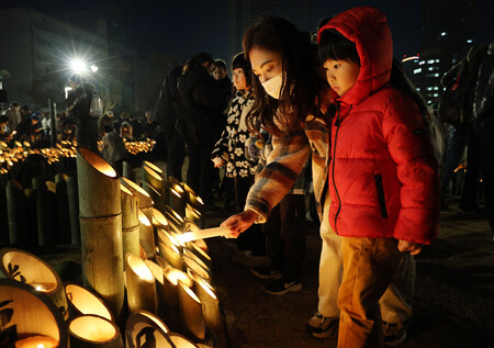 〔写真説明〕阪神大震災の犠牲者を悼み、竹灯籠に火をともす親子=17日午前、神戸市中央区