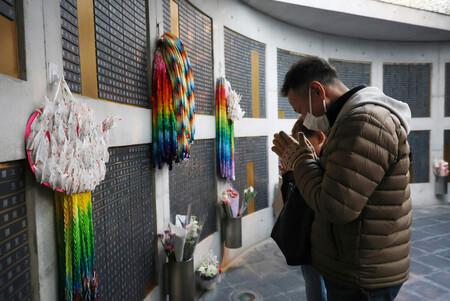 〔写真説明〕阪神大震災で犠牲となった母親の銘板に向かって手を合わせる男性=17日午前、神戸市中央区