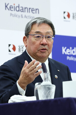 〔写真説明〕2026年春闘の経営側指針について記者会見する経団連の長沢仁志副会長=20日午後、東京都千代田区