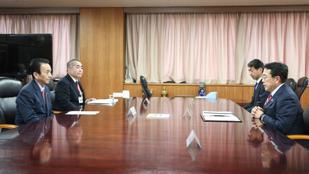 〔写真説明〕中部電力浜岡原発の地震想定に関するデータ不正問題を受けて赤沢亮正経済産業相(右手前)と会談する鈴木康友静岡県知事(左手前)=23日午後、経済産業省