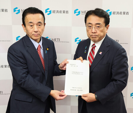 〔写真説明〕中部電力浜岡原発の地震想定に関するデータ不正問題を受けて申し入れ書を赤沢亮正経済産業相(右)に手渡す静岡県の鈴木康友知事=23日午後、経済産業省