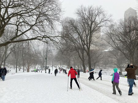 〔写真説明〕25日、雪景色となった米ニューヨーク・マンハッタンのセントラルパークで遊ぶ人たち