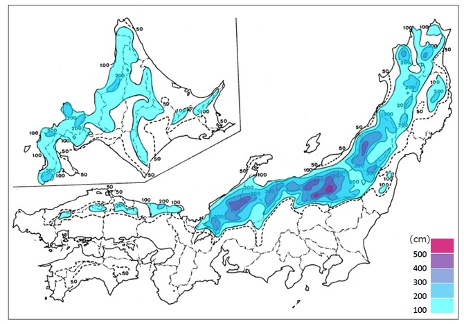 豪雪は単なる大雪とは異なり、降積雪量のほか、広域性や、持続性・反復性も要件となる。五六豪雪について、そのことを確かめてみる。図1は、五六豪雪の冬(1980~1981年冬季)の最深積雪の分布を示す。東北地方から北陸にかけての日本海側で広範囲に2メートルを超え、山間部では4メートルを超えている。福島県の奥只見や、上越国境に近い新潟県土樽(つちたる)では5メートルを超えた。気象台や旧測候所(現・特別地域気象観測所)の中で、五六豪雪の冬に観測された最深積雪がその地点における積雪深の極値(歴代1位の記録)となっている地点がある。それらは、敦賀(福井県、196センチメートル、1月15日)、高山(岐阜県、128センチメートル、1月8日)、山形(山形県、113センチメートル、1月8日)である。