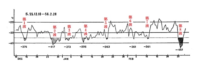 図2は、五六豪雪の冬に石川県輪島で観測された上空500ヘクトパスカル面の気温の経過図である。輪島には気象庁の高層気象観測所があり、冬季には寒波の来襲を監視する重要な役割を担っている。500ヘクトパスカル面は気圧が地表の約半分になる高さで、対流圏を代表する気圧面である。1月の輪島で500ヘクトパスカル面は約5400メートルの高度に相当するが、寒波が来襲した時は5100メートルぐらいに低下する。図2では、摂氏マイナス35度以下の特に顕著な低温期間に陰影が施されている。