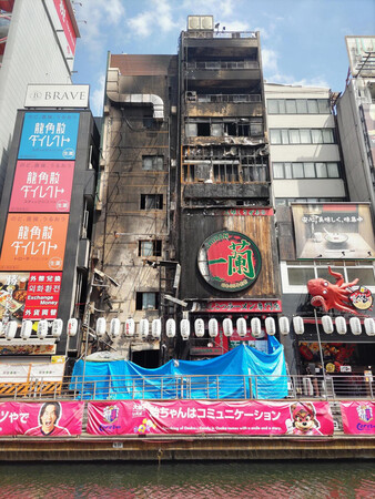 〔写真説明〕火災が起きた道頓堀のビル=2025年8月、大阪市中央区