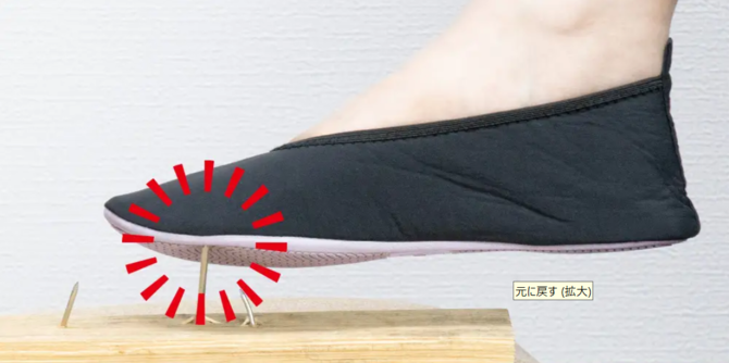 同製品は、カジュアルにもフォーマルにも使用できるシンプルなフラットシューズで、ゴムの履き口による履きやすさを備える。中敷きには、日本産業規格JIS T8101による耐踏抜き性1100ニュートン(112.2重量キログラム)以上の強度を備えた特殊なポリエステル多層構造加工を採用し、釘やガラスの貫通を防ぐ。コンパクトに収納できるポーチが付属し、普段のバッグやスーツケースの片隅に入れて携帯できる。汚れたら手洗い可能。
