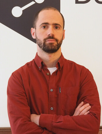 〔写真説明〕ドイツIT企業DeepLの同時通訳ソフト開発チームを率いるレオナルド・ドーイン氏=1月23日、ベルリン