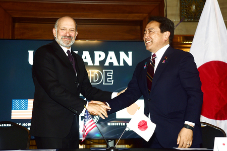 〔写真説明〕日米関税交渉の署名式で握手する赤沢亮正経済再生担当相(当時、右)とラトニック米商務長官=2025年9月4日、ワシントン【時事】