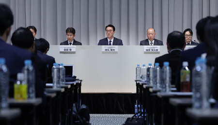 〔写真説明〕社員らが顧客から巨額の金銭をだまし取るなどしていた問題を巡り、記者会見するプルデンシャル生命保険の得丸博充社長(中央)=10日午前、東京都港区