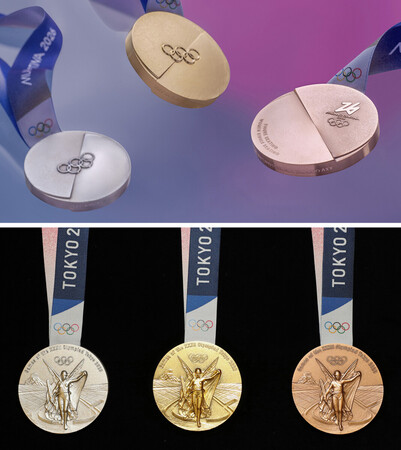 〔写真説明〕ミラノ・コルティナ冬季五輪のメダルデザイン(C)Fondazione Milano Cortina 2026(写真上)と、2021年東京五輪のメダル