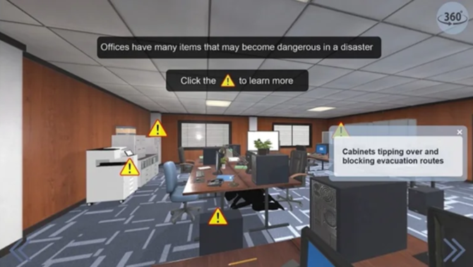 「VR体験」では、「360度VRコンテンツ」によって災害の疑似体験など能動的なトレーニングが可能。オプション(別途費用)で自社のオフィスをVR化した避難訓練教材を制作し、オリジナルコースに追加することもできる。