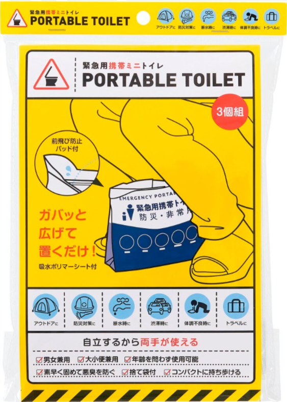 使用後はジッパーを閉じて付属の捨て袋に入れて処理するため、中身が見えにくく、後処理もスムーズに行える。折りたたむとコンパクトで、バッグや車のグローブボックス、防災リュックにもすっきり収納できる。