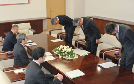 〔写真説明〕東北電力東通原発(青森県)の不正を受け、改善措置計画を報告し、陳謝する同社の石山一弘社長(右列中央)=18日午前、同県庁