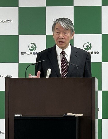 〔写真説明〕記者会見する原子力規制委員会の山中伸介委員長=18日午後、東京都港区