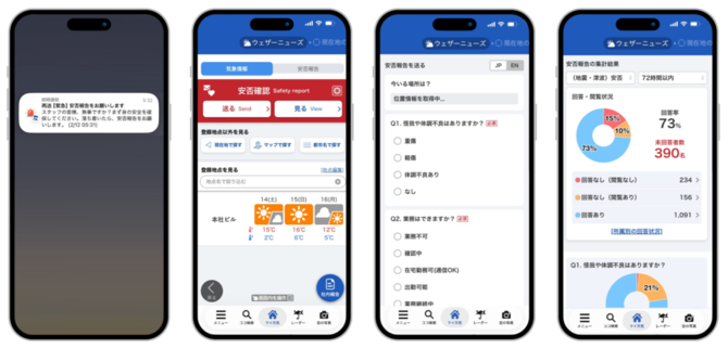 同サービスでは、平常時は「ウェザーニュース」アプリで日々の業務効率化や安全管理を促進する。荒天時や有事の際には、ユーザーの現在地に合わせて雨風への対策状況や翌日の出勤予定などの回答を求めてリスク回避を促す“事前の安全確認”や、“発災時の安否確認”を自動通知する。安否確認の機能は衛星通信サービス「au Starlink Direct」に対応しており、携帯回線が途絶した場合や従業員が圏外エリアにいる場合でも、対応端末であればアプリが「衛星通信モード」に切り替わる。 安否確認だけでなく、有事の判断に欠かせない気象情報の一部も継続利用できる。