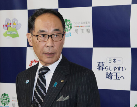 〔写真説明〕埼玉県八潮市の県道陥没事故に関する原因究明委員会の最終報告書を受け取り、記者団の取材に応じる大野元裕知事=19日午後、さいたま市