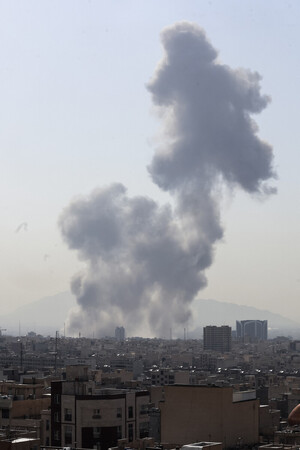 〔写真説明〕28日、イランの首都テヘランで上がる黒煙(AFP時事)