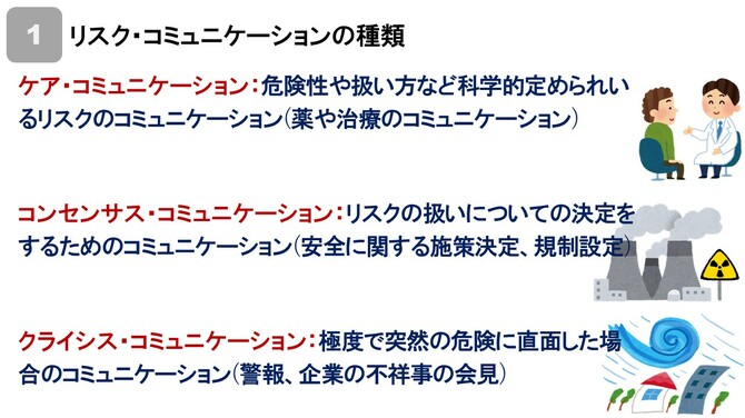 大友氏は、リスク・コミュニケーションの学術的な定義について、「対象の持つリスクに関する情報をリスクに関係する人々に対して可能な限り開示し、一緒に考えることによって解決に導く道筋を探す思想と技術」と紹介。その上で、リスク・コミュニケーションは、危険性や扱い方など科学的定められているリスクのコミュニケーション(薬や治療のコミュニケーション)に代表される「ケア・コミュニケーション」、リスクの扱いについての決定をするためのコミュニケーション(安全に関する施策決定、規制設定)である「コンセンサス・コミュニケーション」、極度で突然の危険に直面した場合のコミュニケーション(警報、企業の不祥事の会見)の「クライシス・コミュニケーション」の3種類に分けられるとしました。