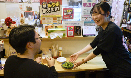 「いらっしゃいませ」。2月、東北学院大学4年の平野佐和さん(22)の声が居酒屋に元気よく響いた。震災後のまちづくりについて学ぶ平野さんは、地域で生活しながら住民の声を聞きたいとお試し移住に参加。この日は居酒屋の仕事体験に挑戦した。「(町民が)話しかけてくれ、距離が近く楽しい」と笑顔を見せる。店主伊東陽子さん(73)も「町民の人柄や食、自然を(ブログで)知り来てくれる人が増えたらうれしい」と話す。