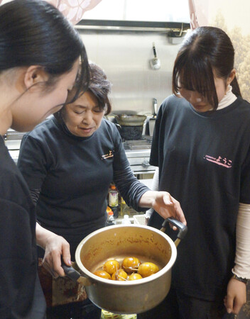〔写真説明〕店主の伊東陽子さん(中央)から話を聞く平野佐和さん(左)ら=2月7日、宮城県女川町