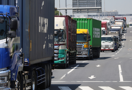〔写真説明〕コンテナ埠頭や貨物ターミナルが集まる地区を走るトラック=東京都大田区