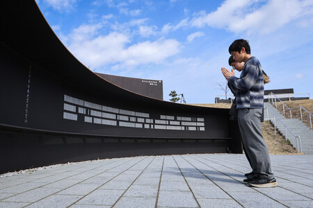 〔写真説明〕東日本大震災の追悼施設「釜石祈りのパーク」で手を合わせる人たち=10日午後、岩手県釜石市