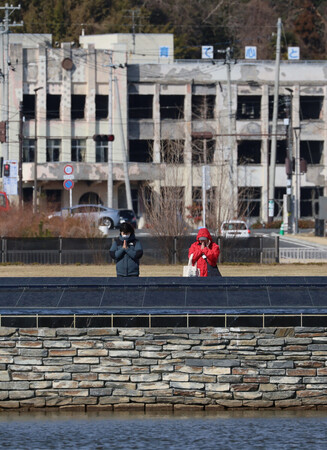 〔写真説明〕東日本大震災の発生から15年を前に、石巻南浜津波復興祈念公園で手を合わせる人。奥は震災遺構の門脇小学校=10日午後、宮城県石巻市