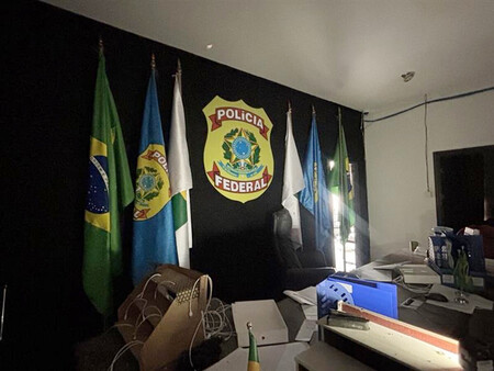 〔写真説明〕カンボジアとの国境地帯にある詐欺拠点に設置されたブラジルの警察署を模した部屋=12日、タイ東北部スリン県