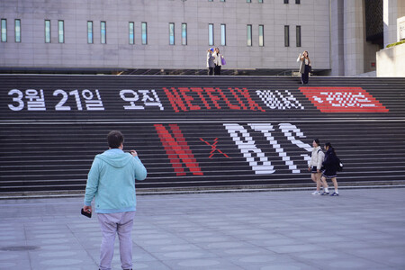 〔写真説明〕韓国の音楽グループ「BTS」が復活公演を開くソウル市中心部の光化門広場周辺の階段に施された広告=13日