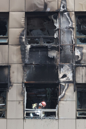 〔写真説明〕15日、ソウルの火災現場で作業する消防隊員(EPA時事)
