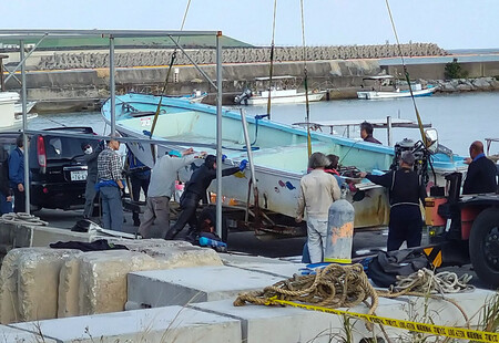 〔写真説明〕辺野古沖で転覆した2隻の船=16日午後、沖縄県名護市の辺野古漁港