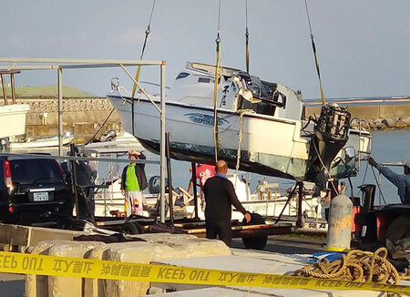 〔写真説明〕辺野古沖で転覆し、岸壁に引き揚げられた「不屈」=16日午後、沖縄県名護市の辺野古漁港