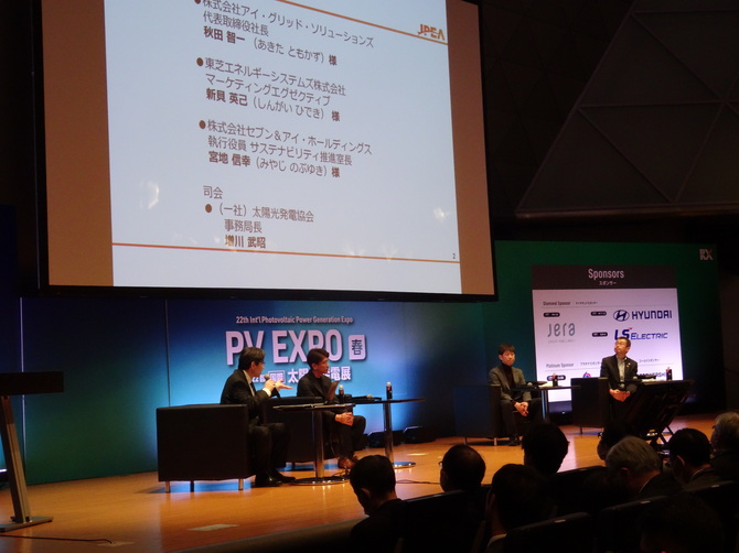太陽光発電協会事務局長の増川武昭氏をモデレーターに、パネリストとして、アイ・グリッド・ソリューションズ代表取締役社長の秋田智一氏、東芝エネルギーシステムズマーケティングセグゼグティブの新貝英己氏、セブン&アイ・ホールディングス執行役員サステナビリティ推進室長の宮地信幸氏が並んだ。