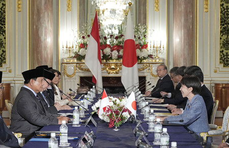〔写真説明〕インドネシアのプラボウォ大統領(左端)と会談する高市早苗首相(右端)=31日午前、東京・元赤坂の迎賓館(代表撮影)