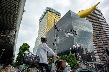 〔写真説明〕アサヒグループホールディングスの本社ビル(中央)=2025年9月、東京都墨田区(AFP時事)