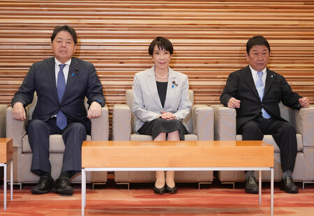 〔写真説明〕閣議に臨む高市早苗首相(中央)=7日午前、首相官邸