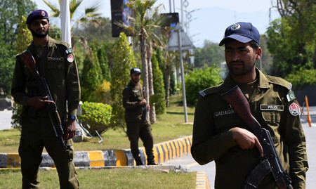 〔写真説明〕10日、イスラマバードで、米イランの和平交渉を控え警備に当たる治安要員(EPA時事)