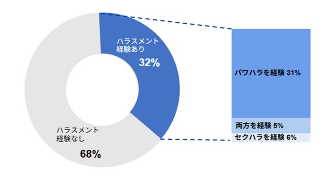 32%が何らかのハラスメントを受けたと答え、内訳は威圧的な叱責や不合理な要求などのパワーハラスメントが31%だった。セクシャル・ハラスメントは全体の6%であったが、性別で見ると女性起業家の23%(男性は3%)に被害が集中していた。
