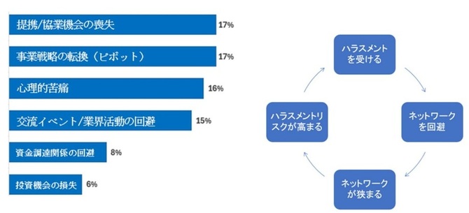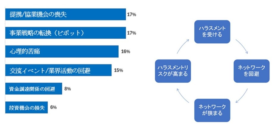 ハラスメントの影響は心理的苦痛という個人にとどまらず、企業間の提携や協業機会の喪失、戦略の転換といった事業そのものに影響を及ぼしている。さらに、調査よりステークホルダーが多様なほど、セクハラの被害が少ない傾向にあり、また、ハラスメント経験者がその後にネットワーキングイベントの参加や業界活動などを避けていた。