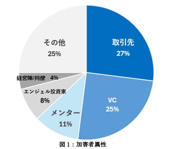 加害者は27%の取引先が最も多く、25%が投資会社であるベンチャーキャピタル(VC)が続いた。事業展開のアドバイスなどを行うメンターが11%を占めた。