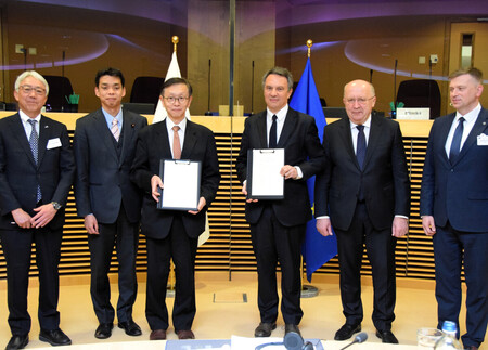 〔写真説明〕日本と欧州連合(EU)の「防衛産業対話」初会合に参加した井野俊郎経済産業副大臣(左から2人目)とクビリウス欧州委員(右から2人目)ら=17日、ブリュッセル(代表撮影・時事)