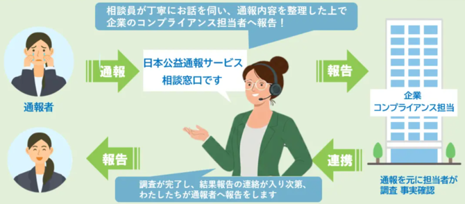 同サービスでは、相談窓口に通報者から通報が入ると、同社の相談員が通報内容を丁寧に聞き取り、顧客企業のコンプライアンス担当者へ報告する。同担当者は、通報内容を調査して事実確認を行い、調査結果を相談員に連絡する。通報者への報告は、相談窓口の相談員が行う。
