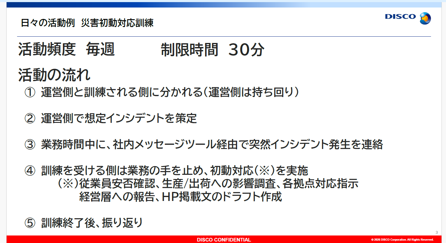 半導体製造装置大手の株式会社ディスコ(東京都大田区)は、平時のコミュニケーションツールを使ったさまざまな危機事案に対応できる初動対応訓練の仕組みを開発し、実践を続けています。メンバーが、危機を発生させる運営チームと対応チームに分かれ、業務中に突発的に危機事案を模擬的に発生させるとともに、通知を受け取ったチームは、即座に、訓練を開始します。リアリティーを追求した結果、たどり着いた手法です。