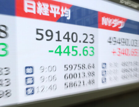買いが一巡した後は最近の急速な株価上昇による相場の過熱感が意識され、利益確定の売りに押された。6万円に到達した達成感も売りを誘い、日経平均は失速。終値は445円63銭安の5万9140円23銭だった。東証株価指数(TOPIX)は28.61ポイント安の3716.38と、2月末に記録した最高値を200ポイント超下回って終わった。