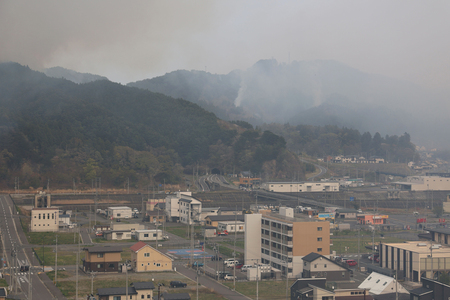 〔写真説明〕市街地と山肌から上がる煙=23日、岩手県大槌町