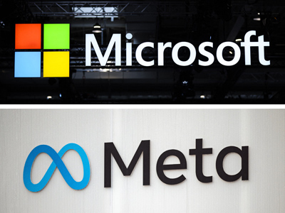 〔写真説明〕米マイクロソフト(写真上)とメタのロゴマーク(いずれもAFP時事)