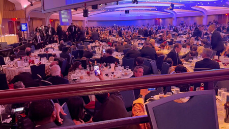 午後8時に始まった夕食会では、主催者であるホワイトハウス記者会の会長があいさつ。演説を控えたトランプ氏は、隣に座る記者らと笑顔で言葉を交わしていた。メラニア夫人のほか、バンス副大統領をはじめとする政府高官の姿もあった。