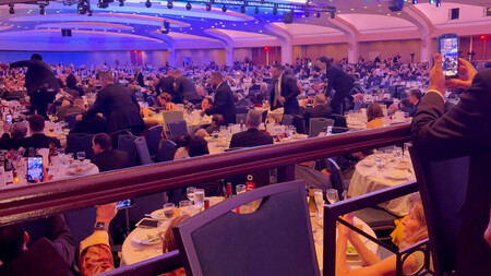 〔写真説明〕25日、トランプ米大統領が出席しワシントン市内で開かれた夕食会で、発砲音が響いた後、騒然とする会場