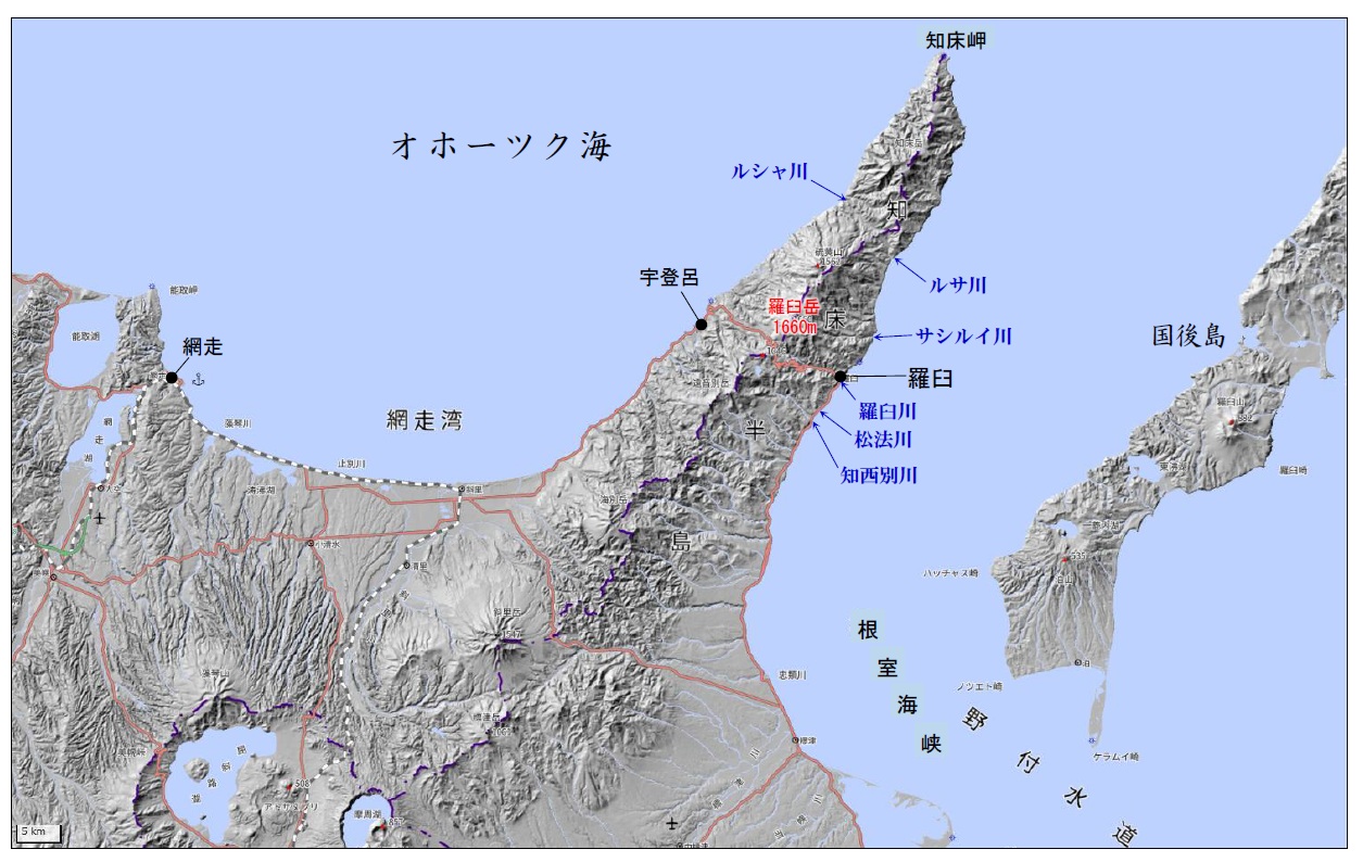 図1に地形図を示す。知床は、北海道の東部から北東の方向へ、オホーツク海に突き出た半島である。半島の長さは約70キロメートル、半島の根元の幅は約25キロメートルで、細長く尖った三角形が特徴である。半島は山脈をなしており、最高峰の羅臼岳(1660メートル)をはじめとする山々が連なり、知床連峰あるいは知床連山と呼ばれる。行政区画としては、根室振興局とオホーツク総合振興局にまたがり、山脈の稜線がその境界となっている。