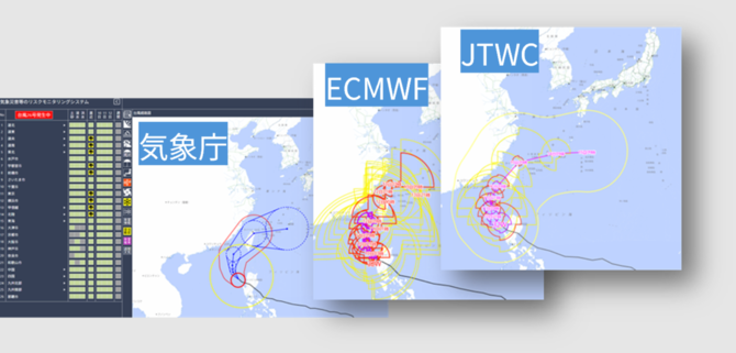 気象災害リスクモニタリングシステム「HalexForesight!」では、複数機関の台風進路予測を同一画面上で重ねて表示する。これにより、予測の違いを把握しながら比較・確認できるようになる。